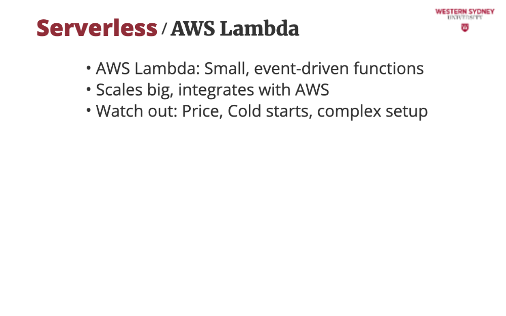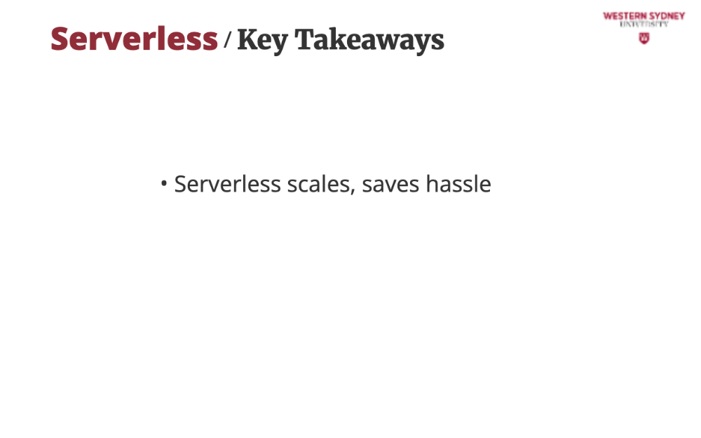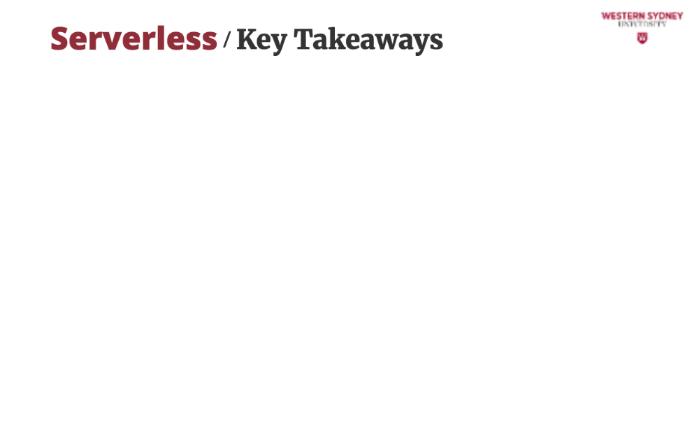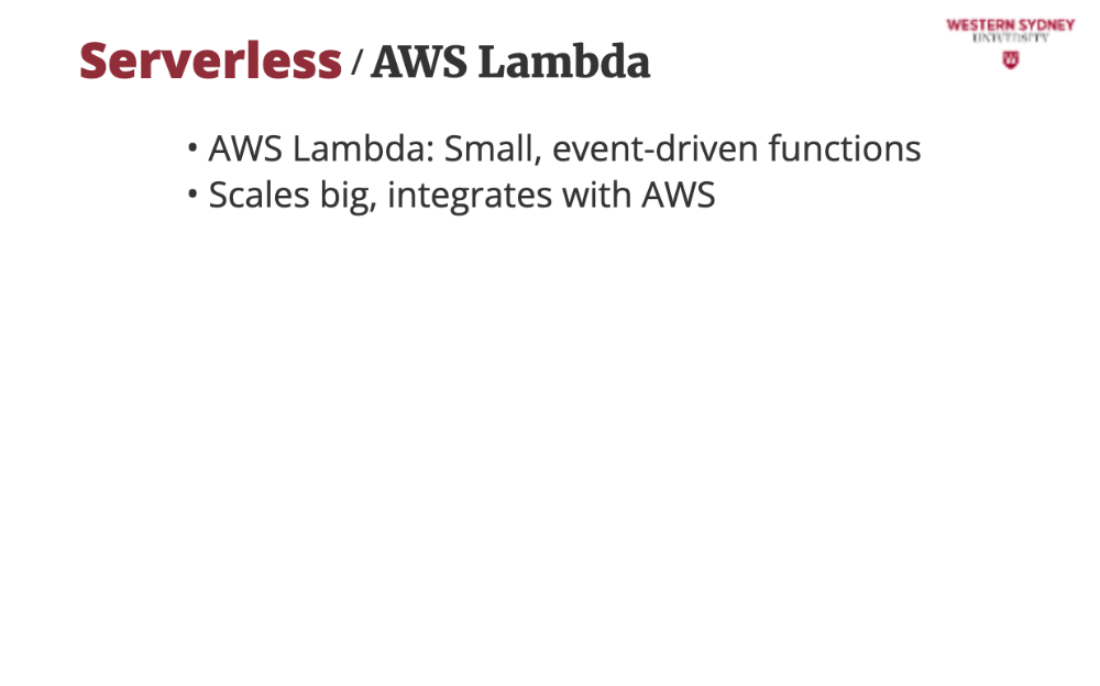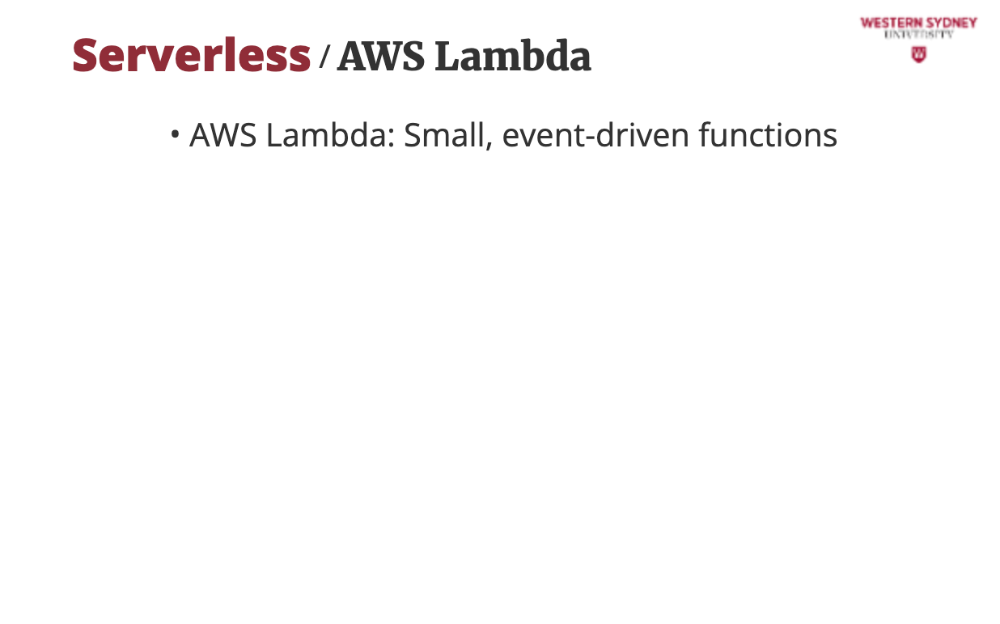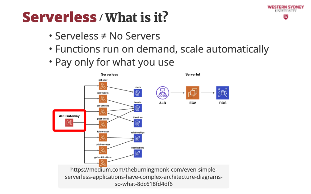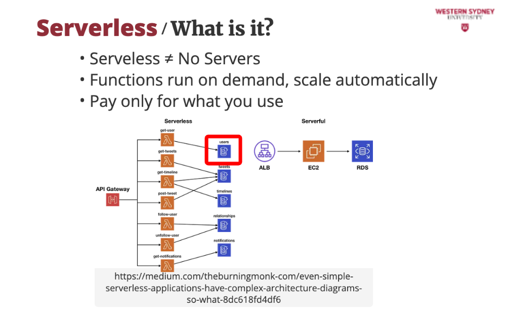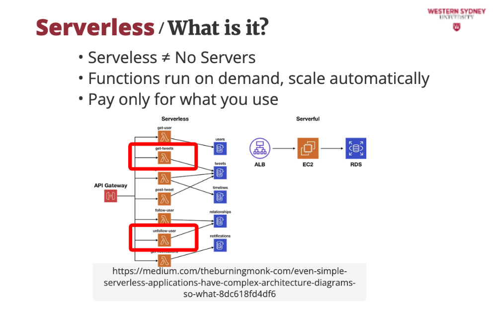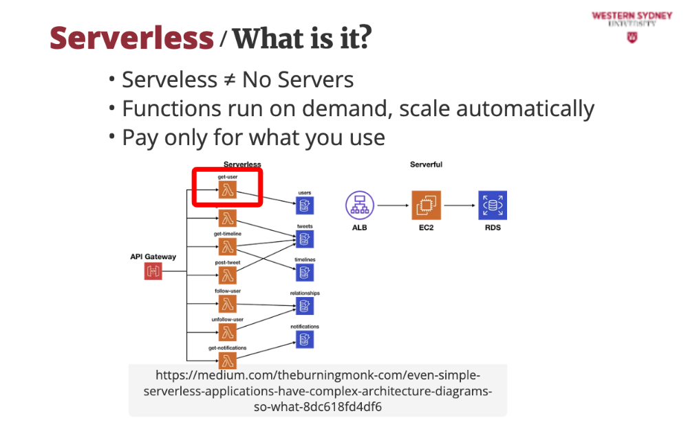 Your app is split into small functions that only run when triggered (e.g., a user requests /posts?tag=tech). Consequently, the server is off when no one is using your app and you are saving money. These functions are stateless, so you store data in databases like DynamoDB or Redis.
