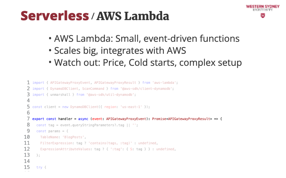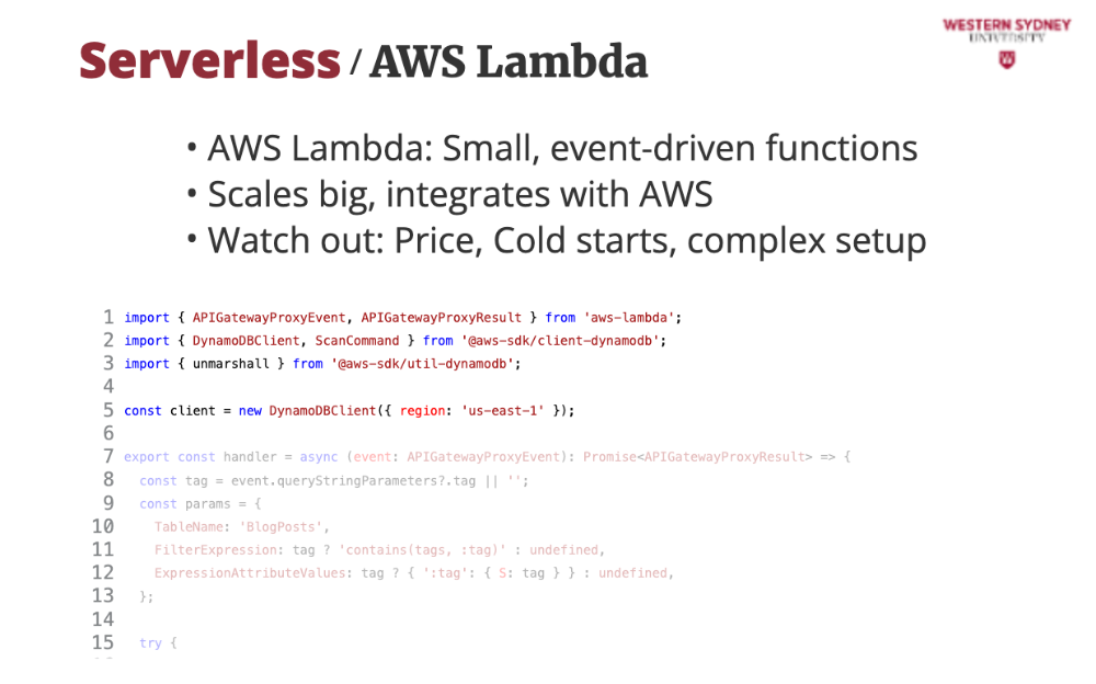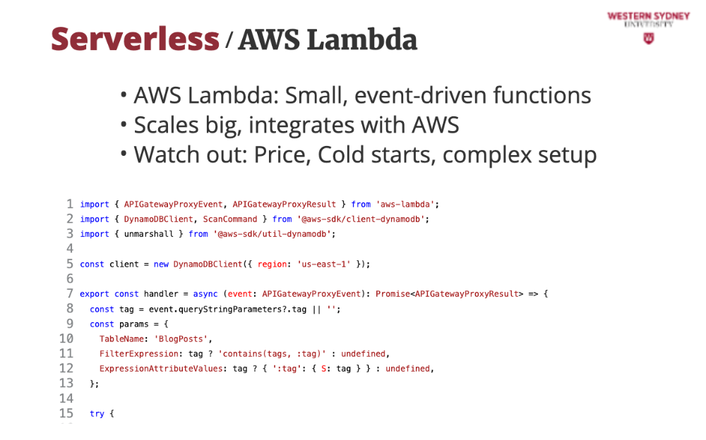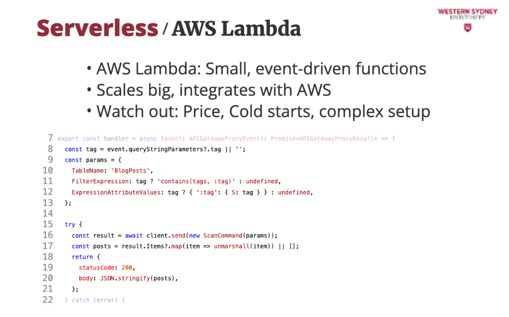 Check out this Lambda function that powers our /api/posts endpoint. It queries DynamoDB, a database for posts, filtering by tag, and scales automatically. Each line builds a robust API, handling user requests with type-safe TypeScript and error handling, perfect for our blog’s backend. And if you are curious what DynamoDB is, it's a database from AWS optimised for serverless access and cross-region replication, so your data is always close to your users.