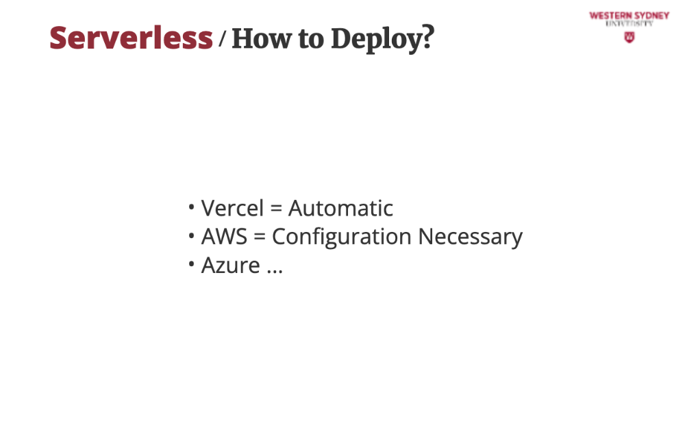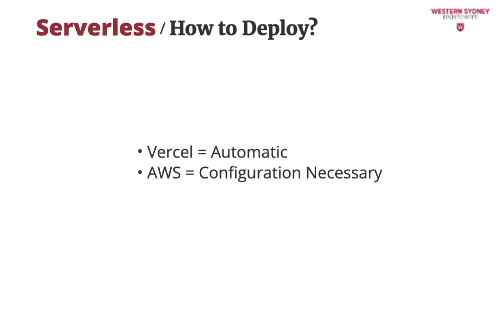 On AWS, you will have to configure your resources, which can be daunting at first, but price is more reasonable than Vercel. Check out the description of this lecture for an example.