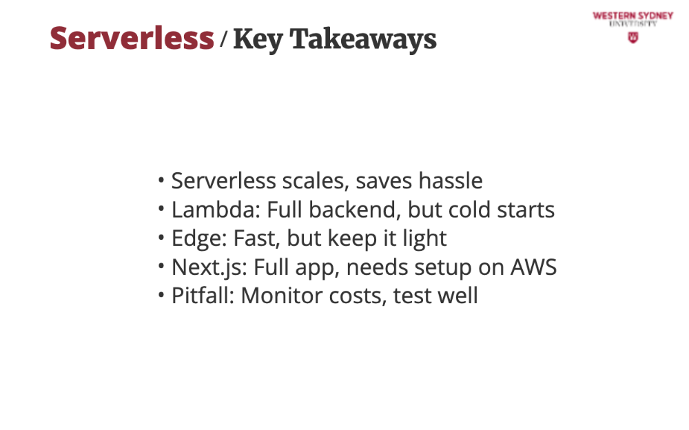 Serverless isn’t free—watch usage and test deployments to keep our blog humming. There are too many horror stories out there with people racking up thousands of dollars bills.