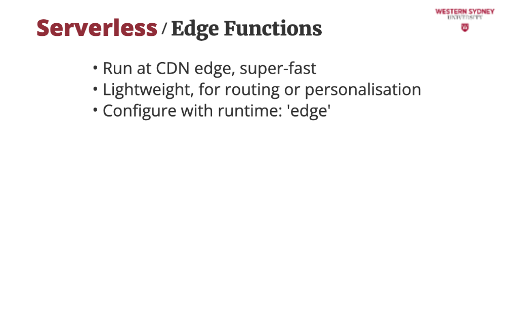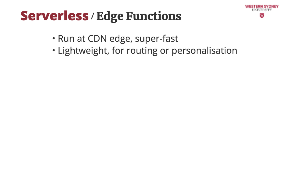 Edge functions run on Content Delivery Networks (CDNs) at locations close to users, minimising latency. They’re great for lightweight tasks like rewriting URLs or personalising content in our blogging app. Unlike Lambda, they run in V8 isolated, not full Node.js, so they’re leaner but less powerful.