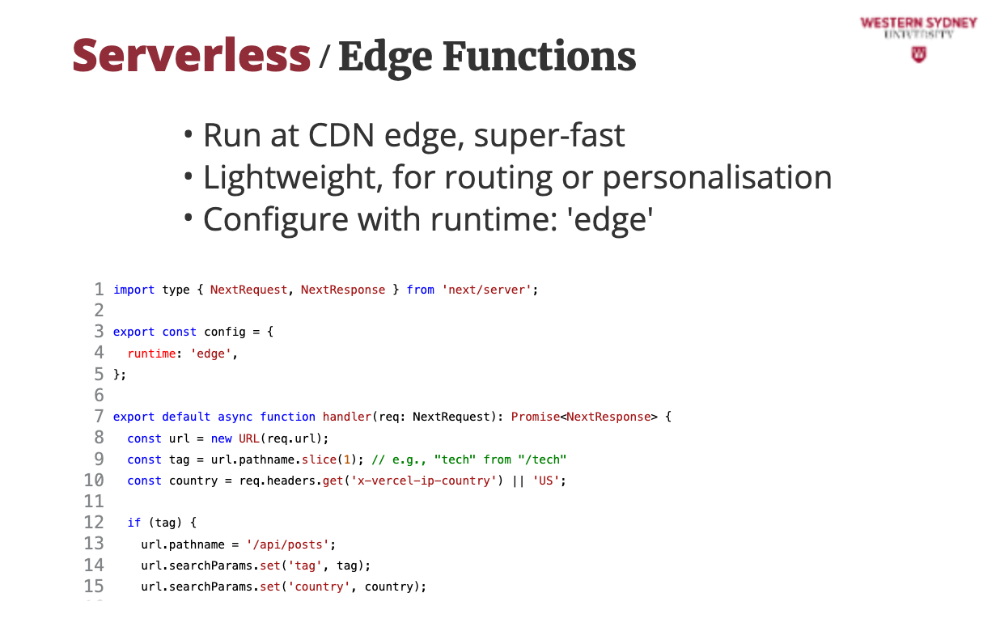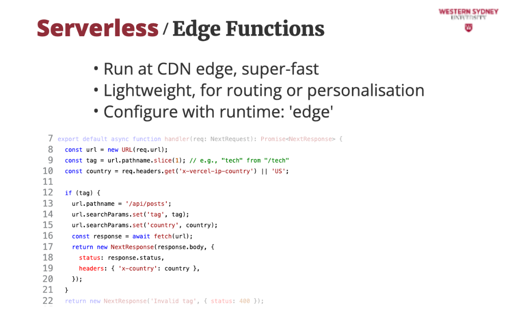 Edge functions are a super fast alternative to serverless lambda functions, this time supported by Vercel deployments. Edge functions execute close to users—Tokyo, London, anywhere—cutting latency to under 50ms for snappy blog responses.