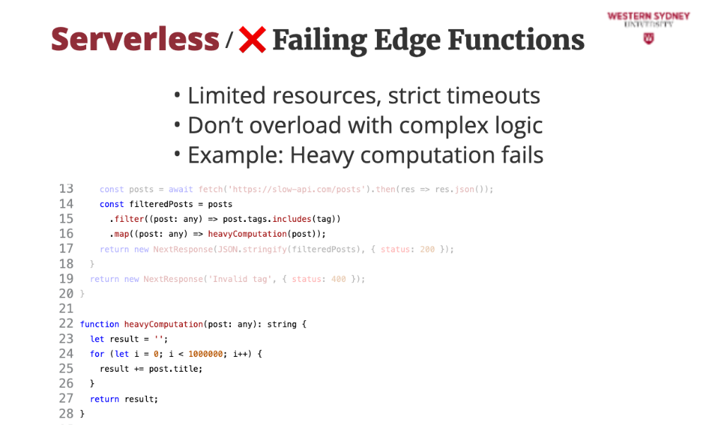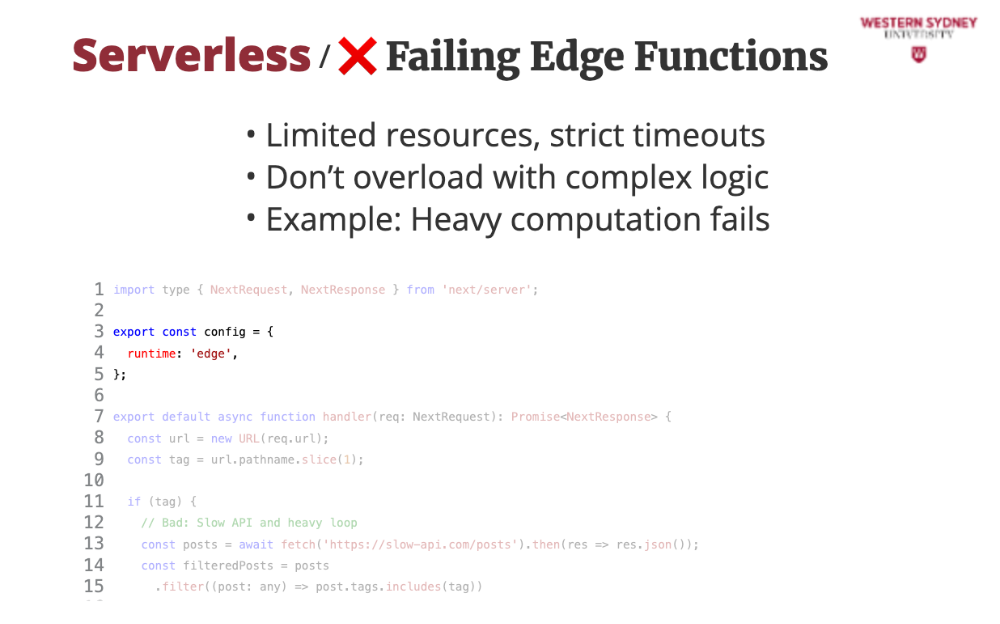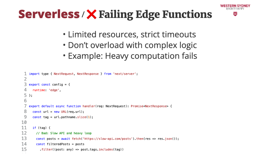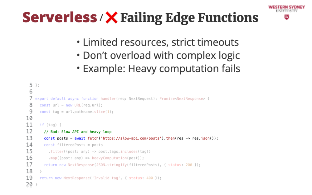 Let’s see a mistake that breaks our blog’s edge function, teaching us what to avoid. This edge function tries filtering posts directly, but it’s a disaster! The slow API and heavy loop exceed edge limits, timing out. Instead, it should rewrite to a Lambda function, keeping our blog fast and teaching us to keep edge logic light.