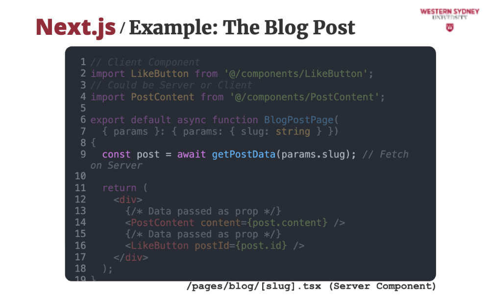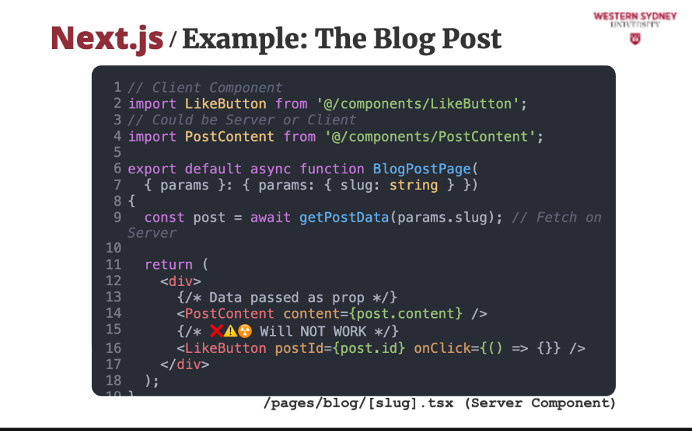 The real power comes from combining these two types of components. Our blog page can use a Server Component to fetch the initial blog post data and a Client Component for the "Like" button.
