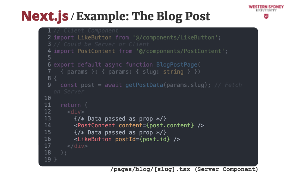 It then renders the PostContent and the LikeButton Client Component. Critically, it passes the necessary data, the post content and post id, as props to the Client Component. The Client Component then uses this data for its interactivity, like sending a "like" request to the server, but it does not fetch the initial post content itself. This illustrates the flow of data from Server to Client.