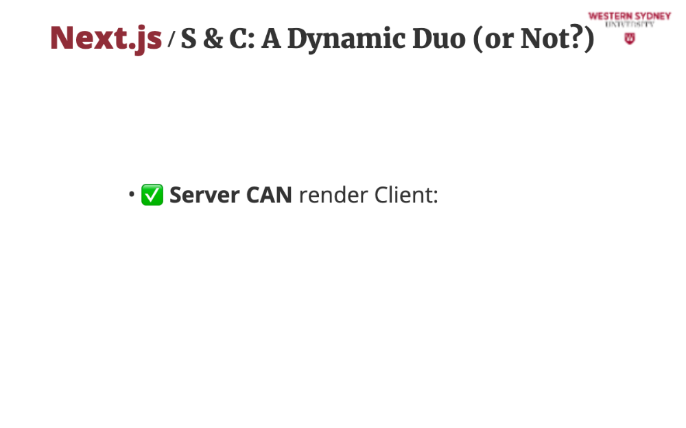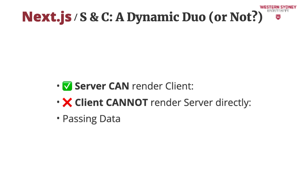 The way we connect these two worlds is through props. Server Components can pass data down to Client Components as props. This is how the server provides the initial information that the client then uses for interactivity.