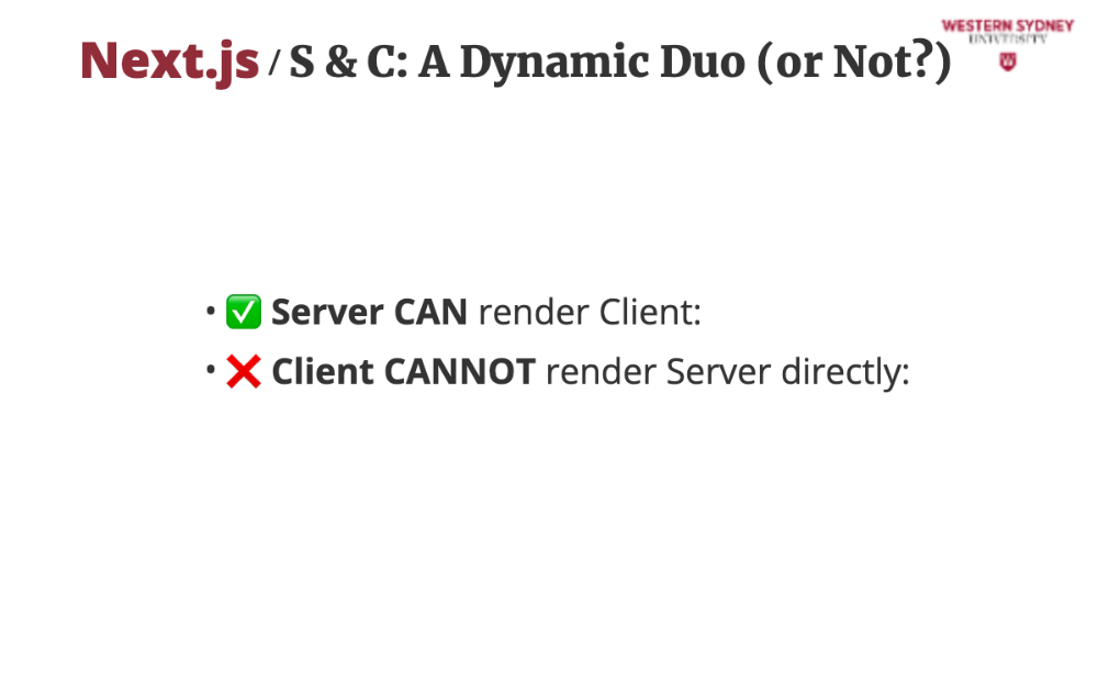 However, Client Components cannot directly render Server Components. This is because Server Components are executed on the server, and the client doesn't have access to that environment. It's like trying to have a conversation with someone who's in another room – you need an intermediary.