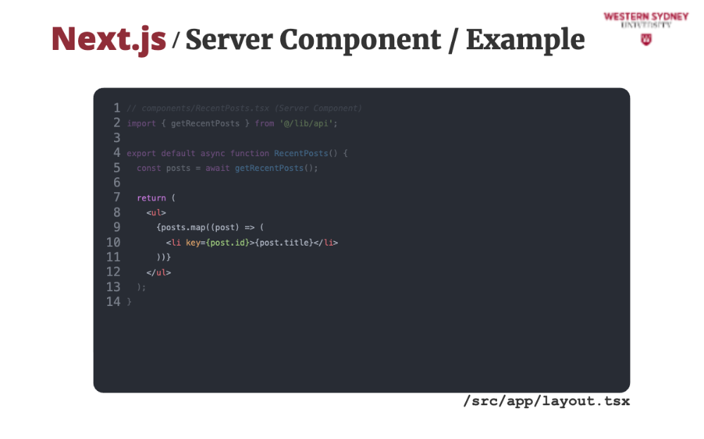 This line fetches the recent posts data on the server. Note that the server components are asynchronous, and we can use asynchronous functions to retrieve our data. We'll cover data retrieval soon!