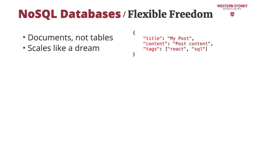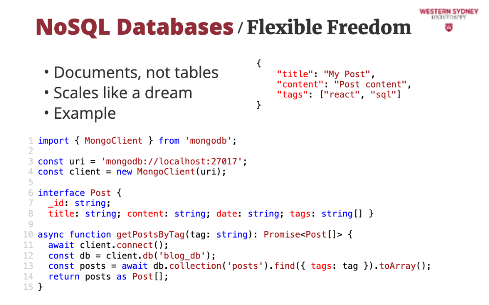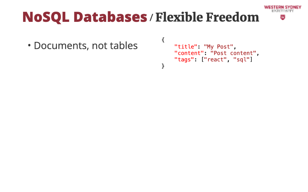 NoSQL databases ditch tables for more dynamic structures. In MongoDB (a popular choice), data is stored as JSON-like documents. For our blogging app, a post might look like this: