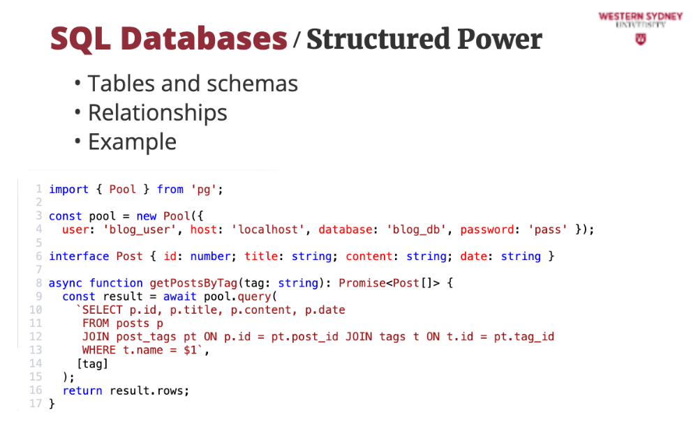 Now, in a Next.js app with TypeScript, we’d use a library like pg to query it. Here’s how to fetch posts by tag: