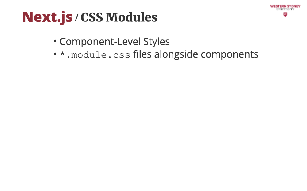 We place the .module.css file (or .module.scss for Sass) right next to the component file itself. This establishes a clear connection between the component and its styles.