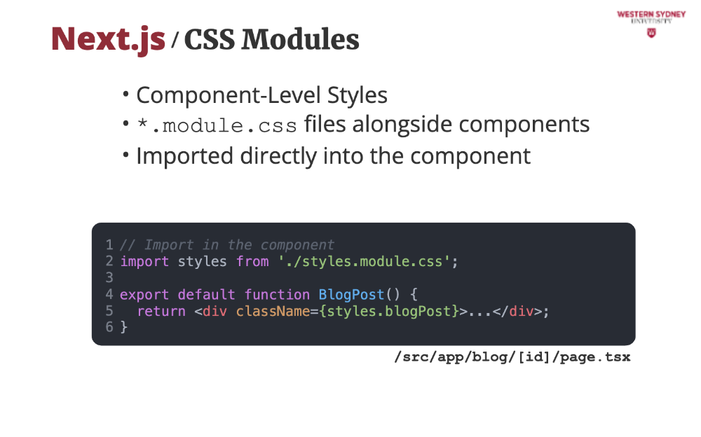 Here's a typical example. We import styles from the corresponding module css file. Next.js handles the rest, ensuring the styles are only scoped to this component.