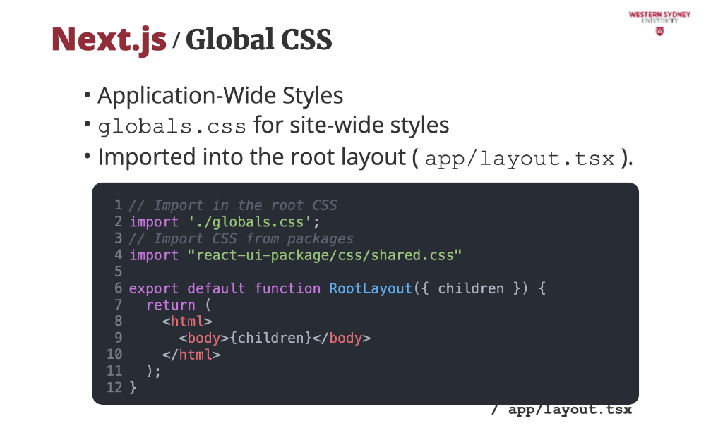.module.css file (or .module.scss for Sass) in the same directory as the component itself. This keeps the styles closely tied to the component, making our codebase easier to manage.app/layout.tsx. Importing global CSS here ensures that these styles are available throughout your blog.globals.css file (or similar) where you include the @tailwinddirectives. This file, containing your Tailwind setup, is then imported into your root layout (app/layout.tsx), just like global CSS. This makes the Tailwind utilities available across your entire application.app/layout.tsx) if the external styles are intended to be global, or within a specific component if the styles are only needed there. Just remember, you must import the stylesheet directly from the npm package or a colocated file; you cannot use <link rel="stylesheet" />..module.scss) or global (.scss), follow the same import rules as regular CSS files. Module-specific Sass goes into the corresponding component's directory and is imported there, while global Sass can be imported into the root layout.Key takeaway: The location of your CSS import depends on the scope of the styles. Component-specific styles (CSS Modules and sometimes external stylesheets) are imported into the components themselves. Global styles (global CSS, Tailwind setup, or global Sass) are imported into the root layout to ensure they're applied everywhere. Keeping this pattern consistent will make our blog's styling much more maintainable.