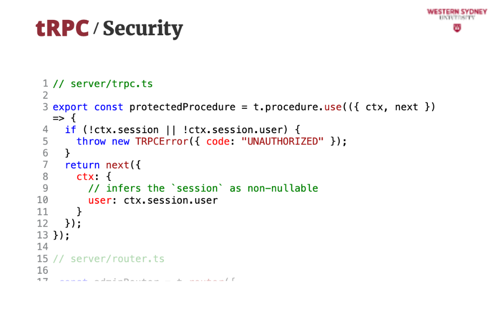We can then use this protected procedure to define routes accessible only to authenticated users.