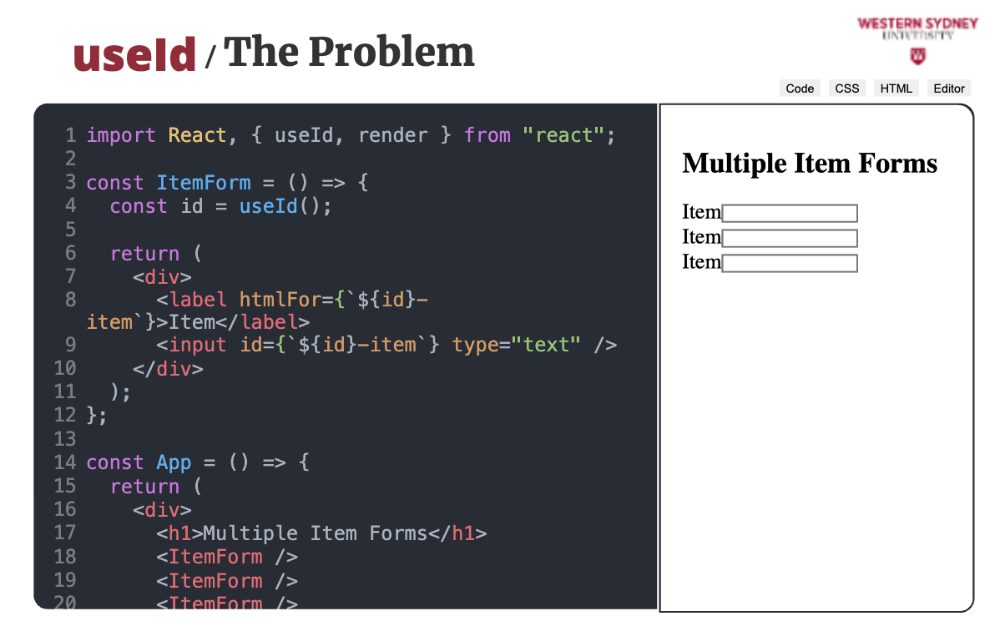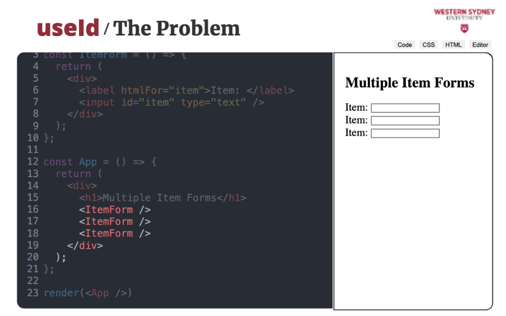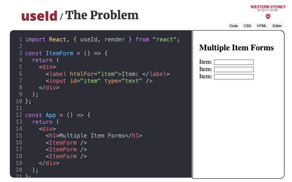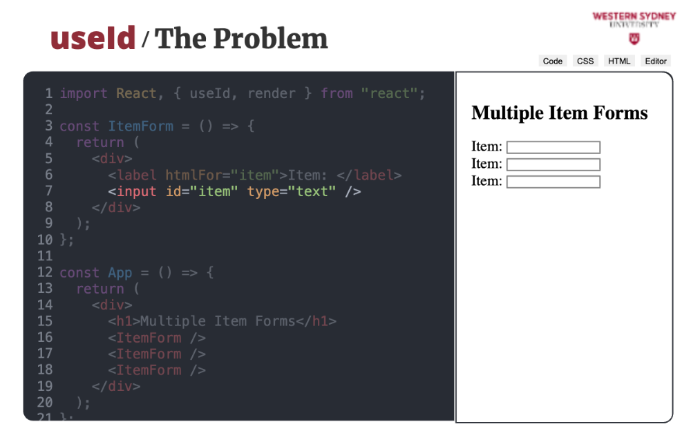 export default App;Here’s an example of using useId to fix it and generate unique id attributes for form inputs: