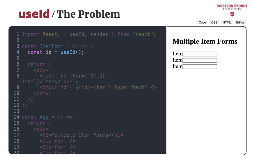 useId?useId WorksThe useId hook generates a unique string that you can append to identifiers for better readability.