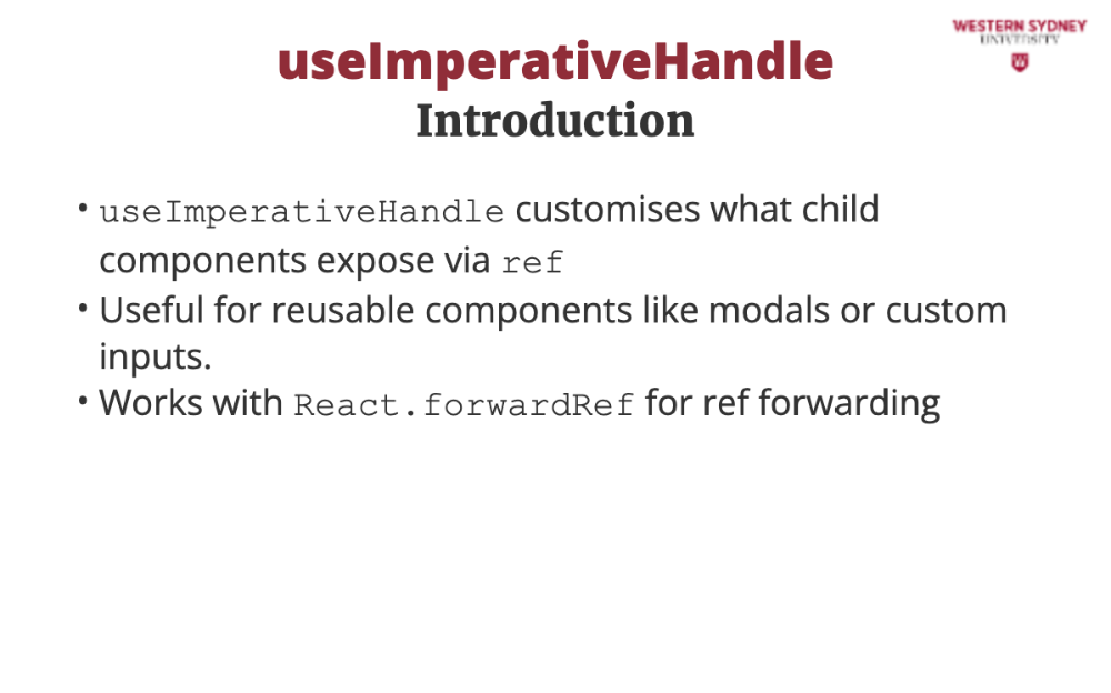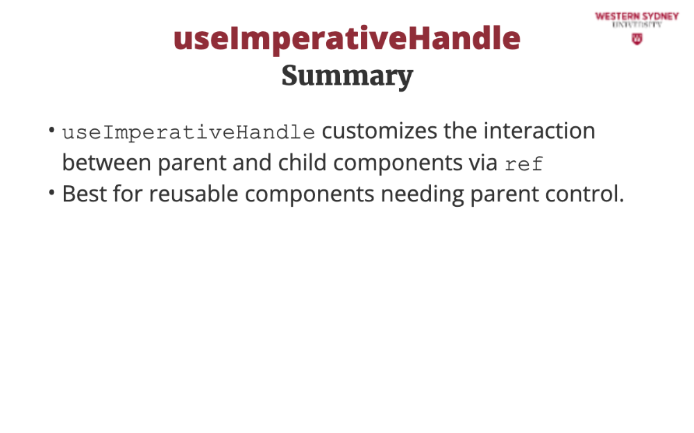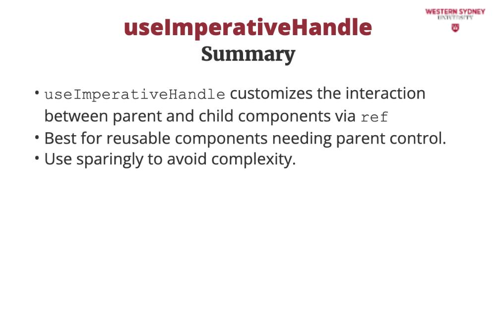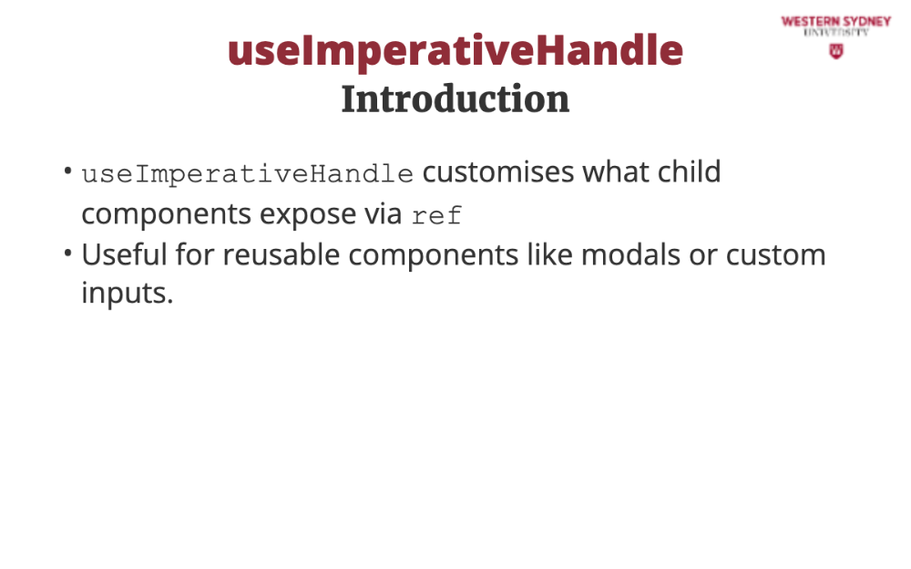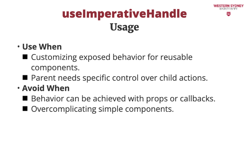 Use useImperativeHandle when you want to customise what the parent can interact with, especially for reusable UI components like modals or dropdowns.