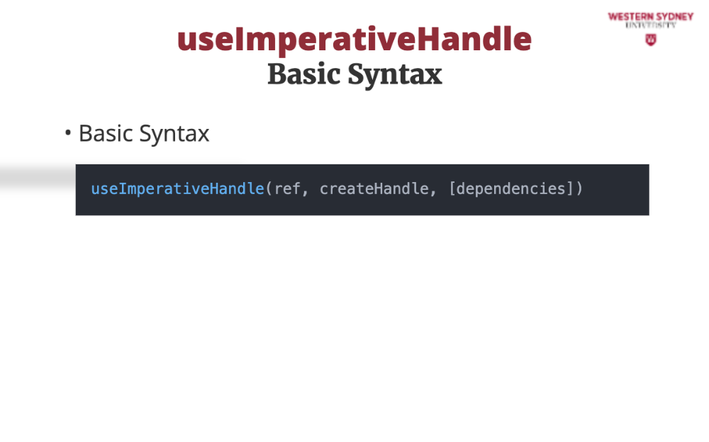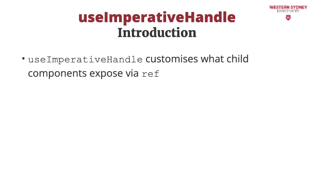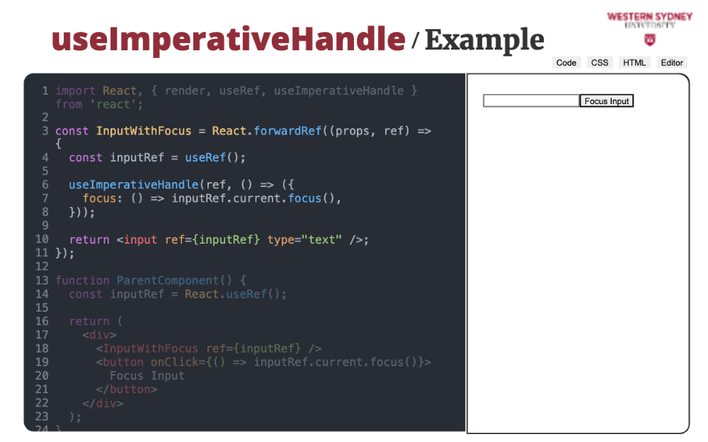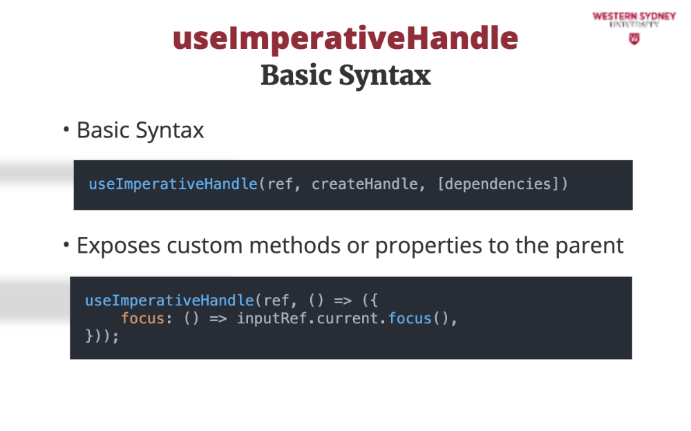 In this example, the parent passes the ref to the child component, which expects to populate the ref's current value with the defined imperativeHandle, containing the focus function.