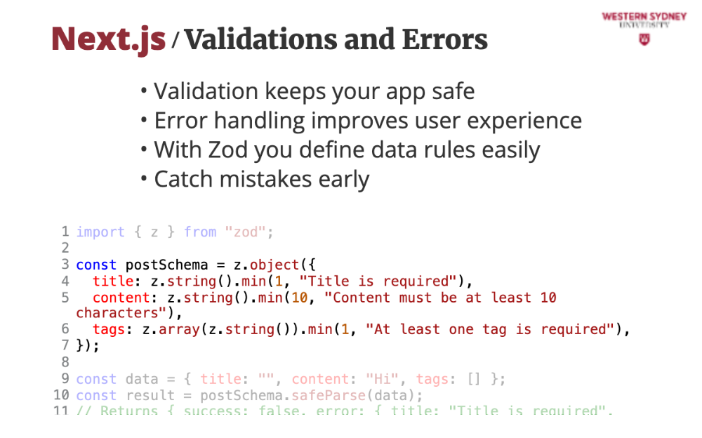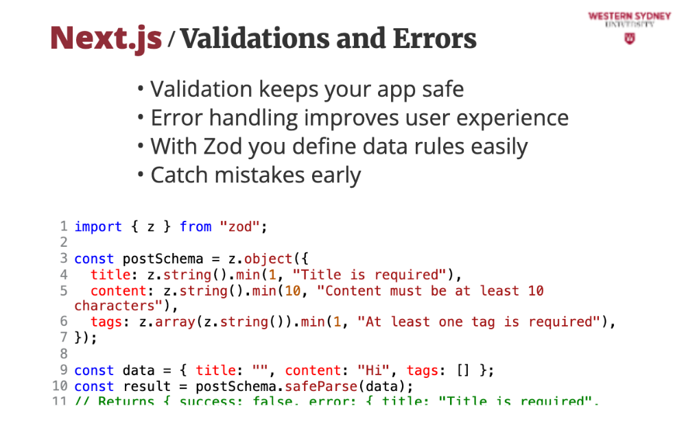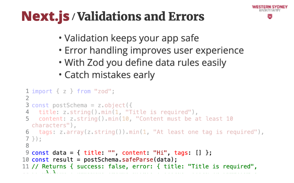 Let’s start with validation. A common misconception is that you can trust user input—like assuming every admin will enter a perfect post title. Nope! Users make mistakes, and some might even try to break your app. That’s why we use a library like Zod to enforce rules.