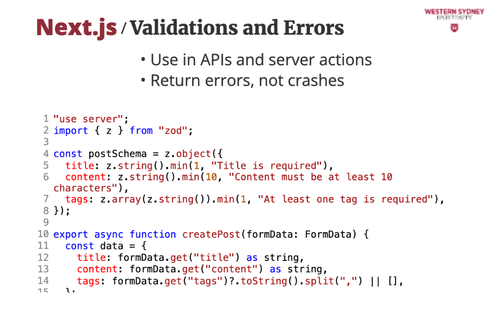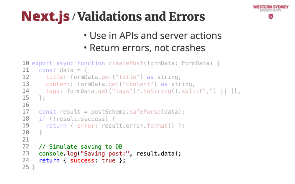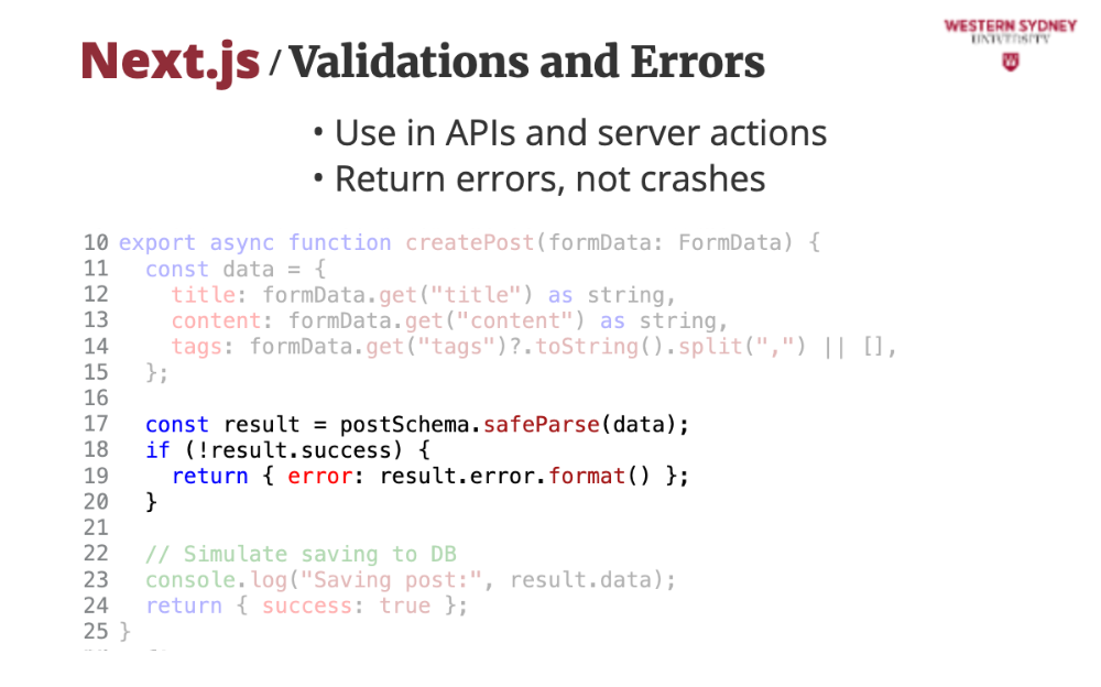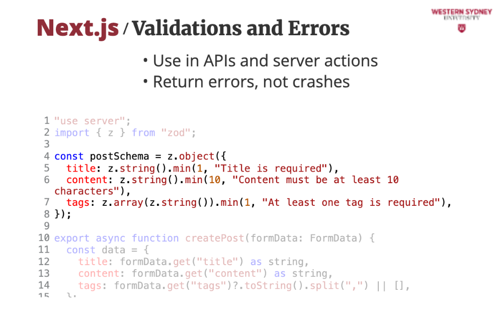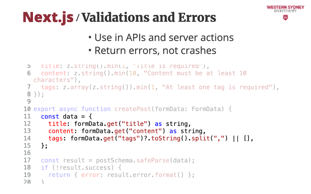 This server action validates a new blog post from a form. It’s a full example you can test—just hook it to a form and try submitting bad data!
