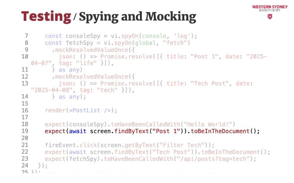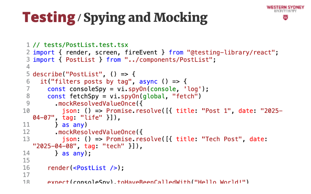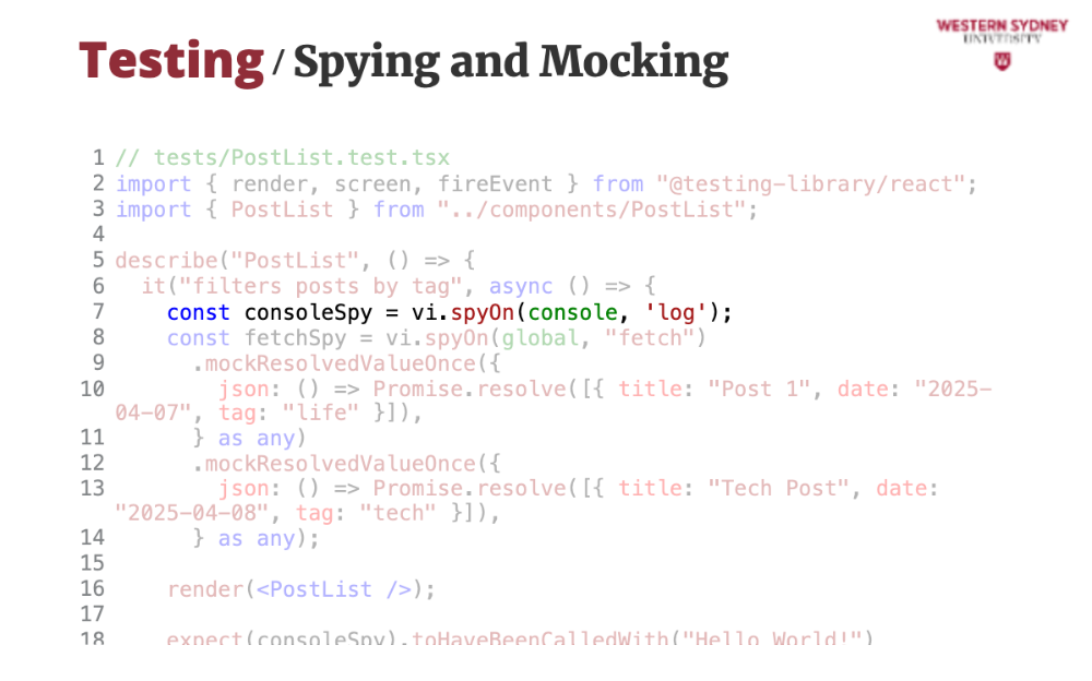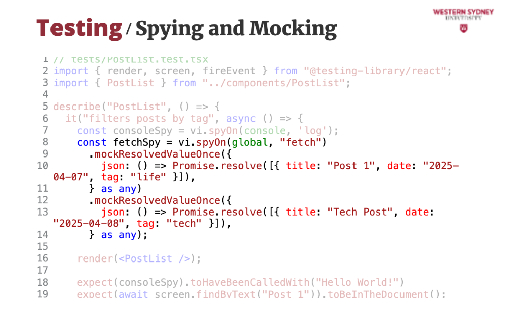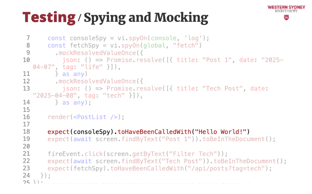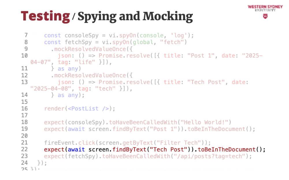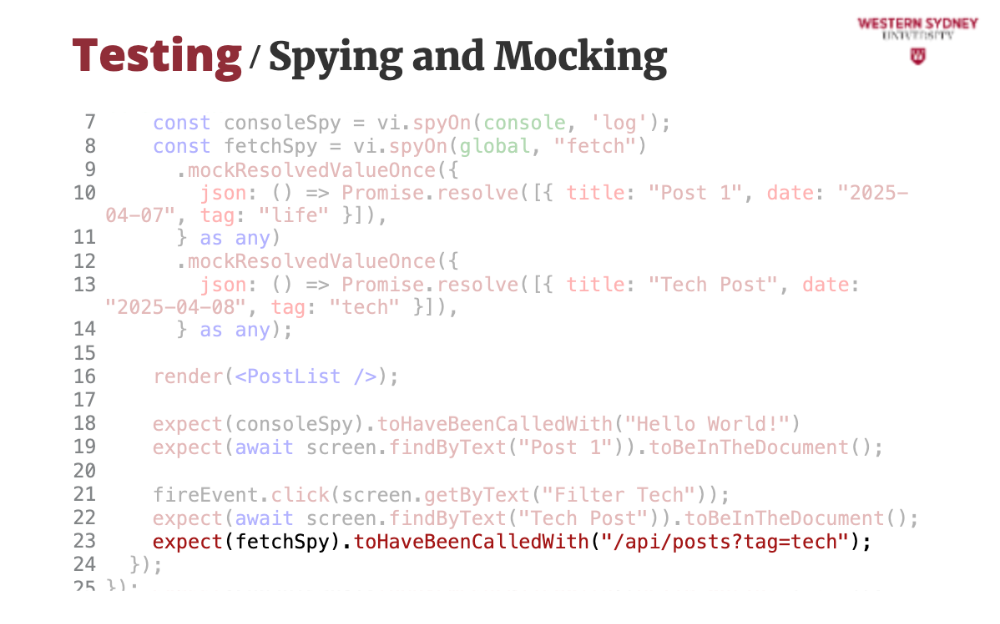 fetchSpy tracks calls and confirms the filtered URL.Spying and mocking let us fake behavior and inspect calls, crucial for integration tests.