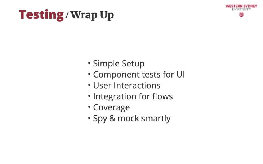 On this line, we will test whether the console log was called with the text Hello World! There are many other assertions that you can use with spies; please check out the documentation.