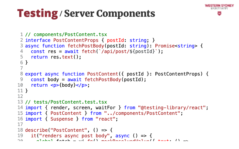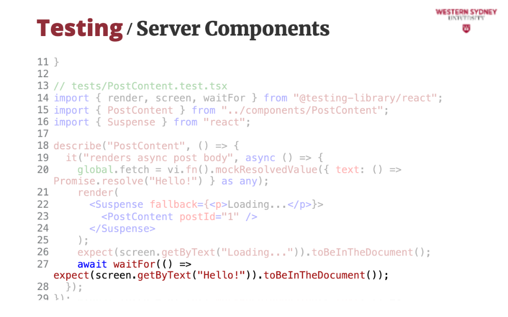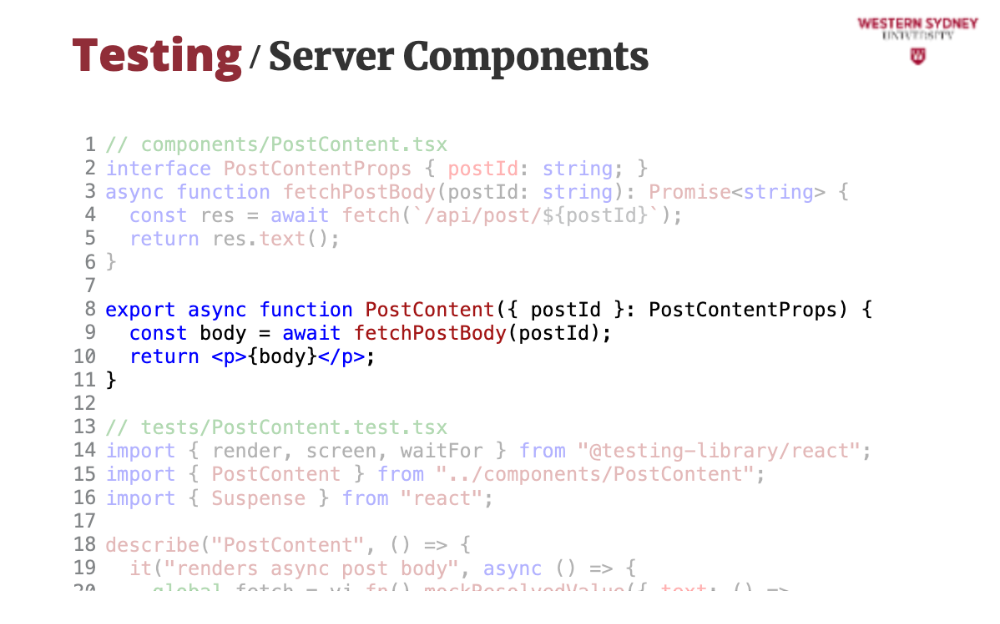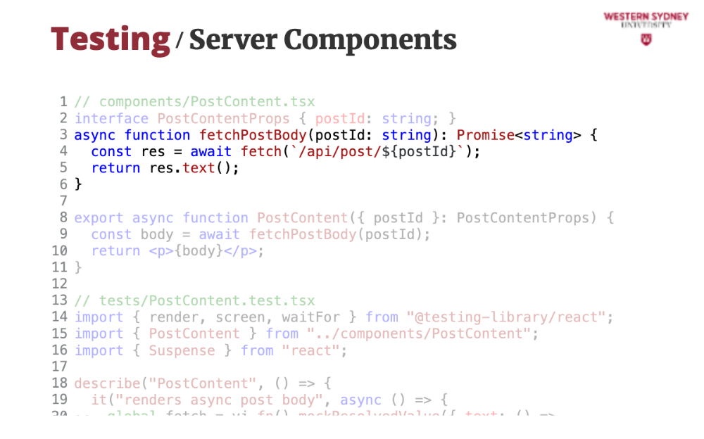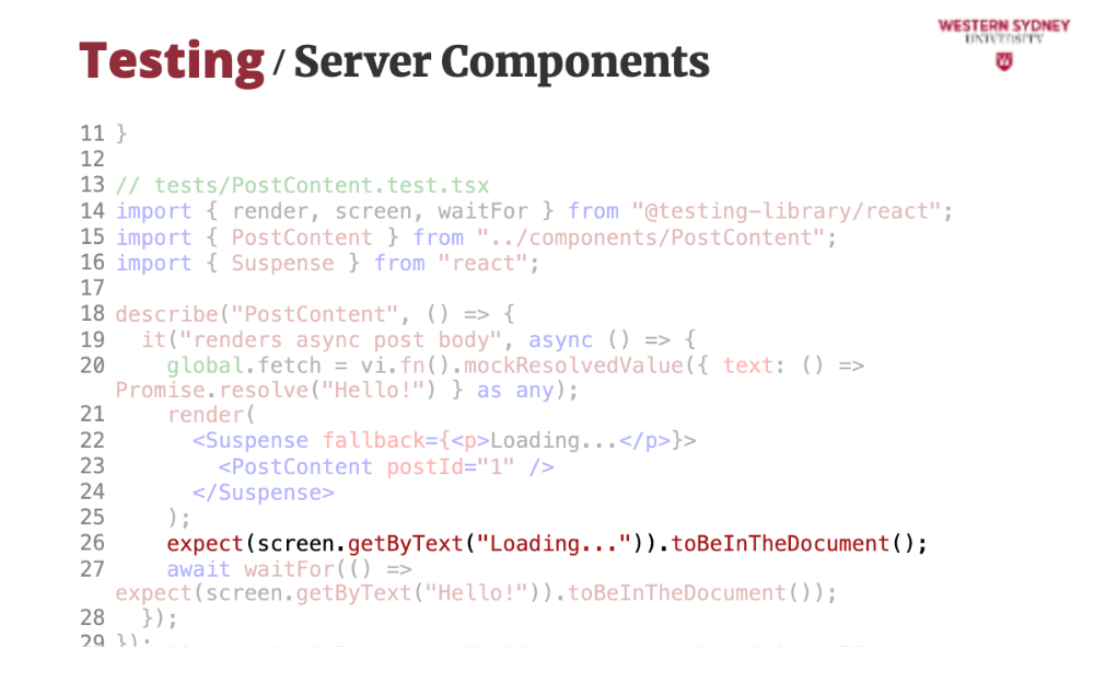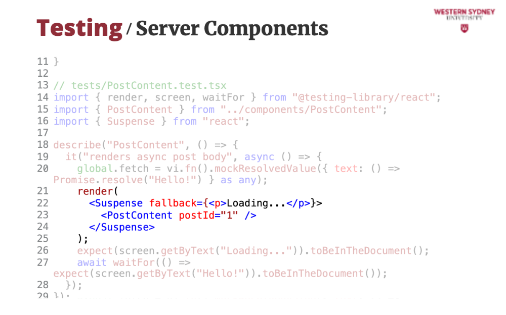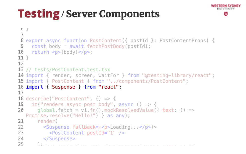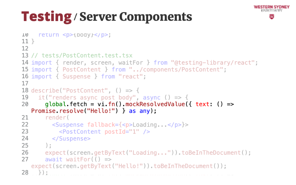 });screen.getByText. Vitest runs this in jsdom, simulating a browser.React 19 improves async rendering. Let’s test an async PostContent component: