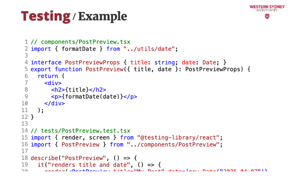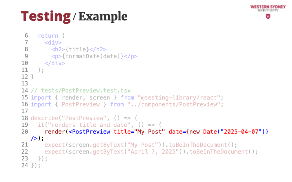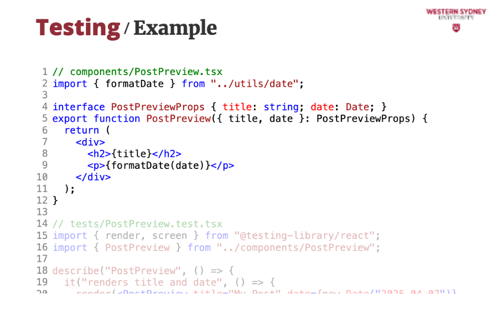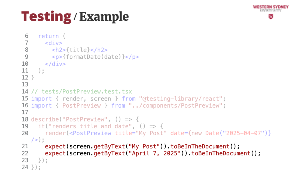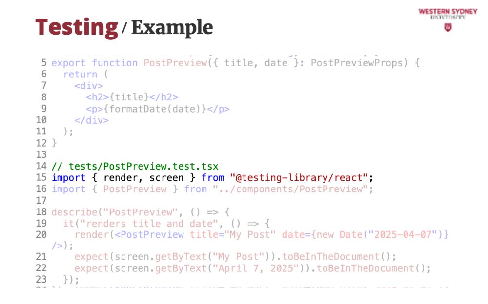 });npm test. If “1 passed” shows, you’re set!pages/, components/, and utils/. Tests go in tests/ or next to files (e.g., components/PostPreview.test.tsx).Component testing ensures individual React components work in isolation—like a single post preview in our blogging app.