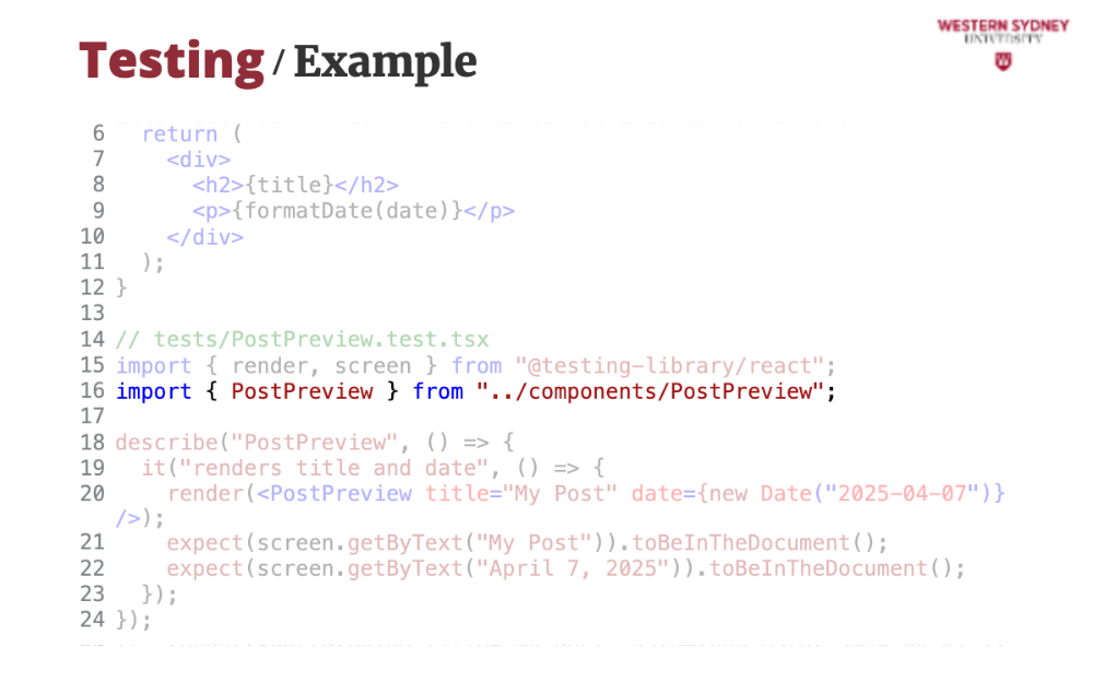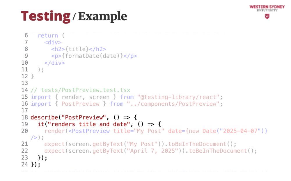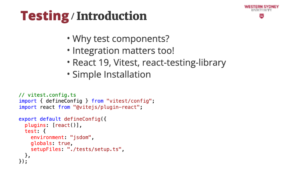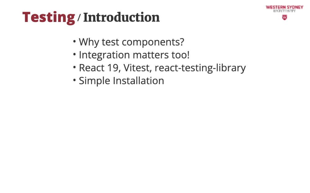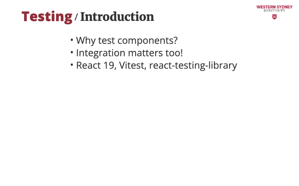 In this lecture, we’ll use Vitest, React Testing Library, and React 19’s async powers.