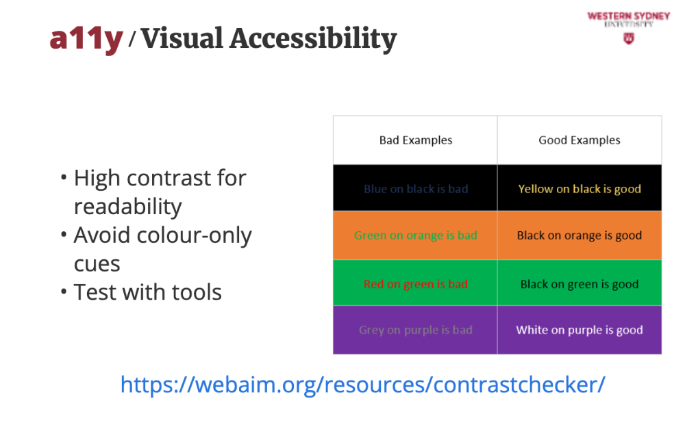 Ensure to use high text contrast for better readability on coloured backgrounds. WCAG requires a 4.5:1 contrast ratio for text. For example, use dark borders and underlines to meet this.